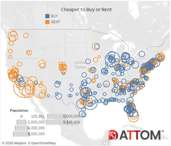 Affordability drives that answer for most people and it is cheaper to buy a home than rent in the majority of the U.S. in 2026, according to a report from Attom. However, it also showed property values growing at a faster pace than rental prices overall.