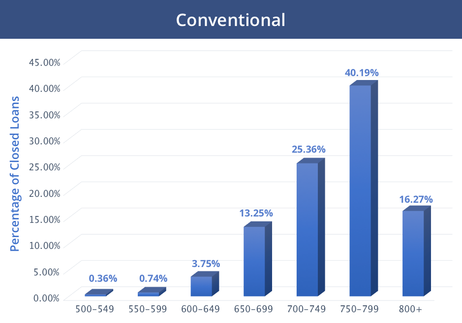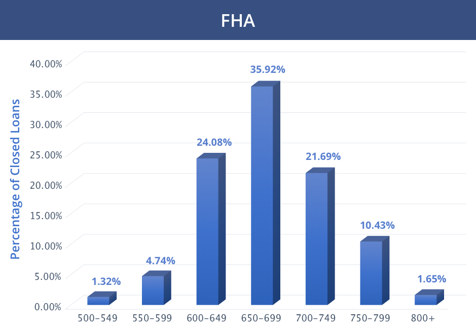 Smith says your goal should be a credit score over 700. This increases your chance of getting a better loan at a lower interest rate. Most loans allow lower scores, however. The graphics from Ellie Mae shows the distribution of approved loans in March 2018 by credit score for conventional (non-government) and FHA mortgages.